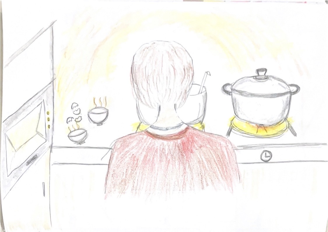 進入在樓梯後面的廚房,讓X一時覺得自己回到求學時期的學生餐廳。明亮且寬廣的空間搭配上大片落地窗,從落地窗進入的自然風在廚房內的每一處流動著;該有的配備應有盡有,瓦斯爐、電磁爐、烤箱。喚來管家煮上X喜愛的菜肴。水龍頭水質乾淨,米缸是透明的塑膠桶,裝有八分滿的新鮮米,沒有水缸。生命花是一朵半開的粉紅色蓮花,生長狀態健康,且似乎正鼓舞著X「不用急、也無需擔心,再努力一點就能達成理想」。